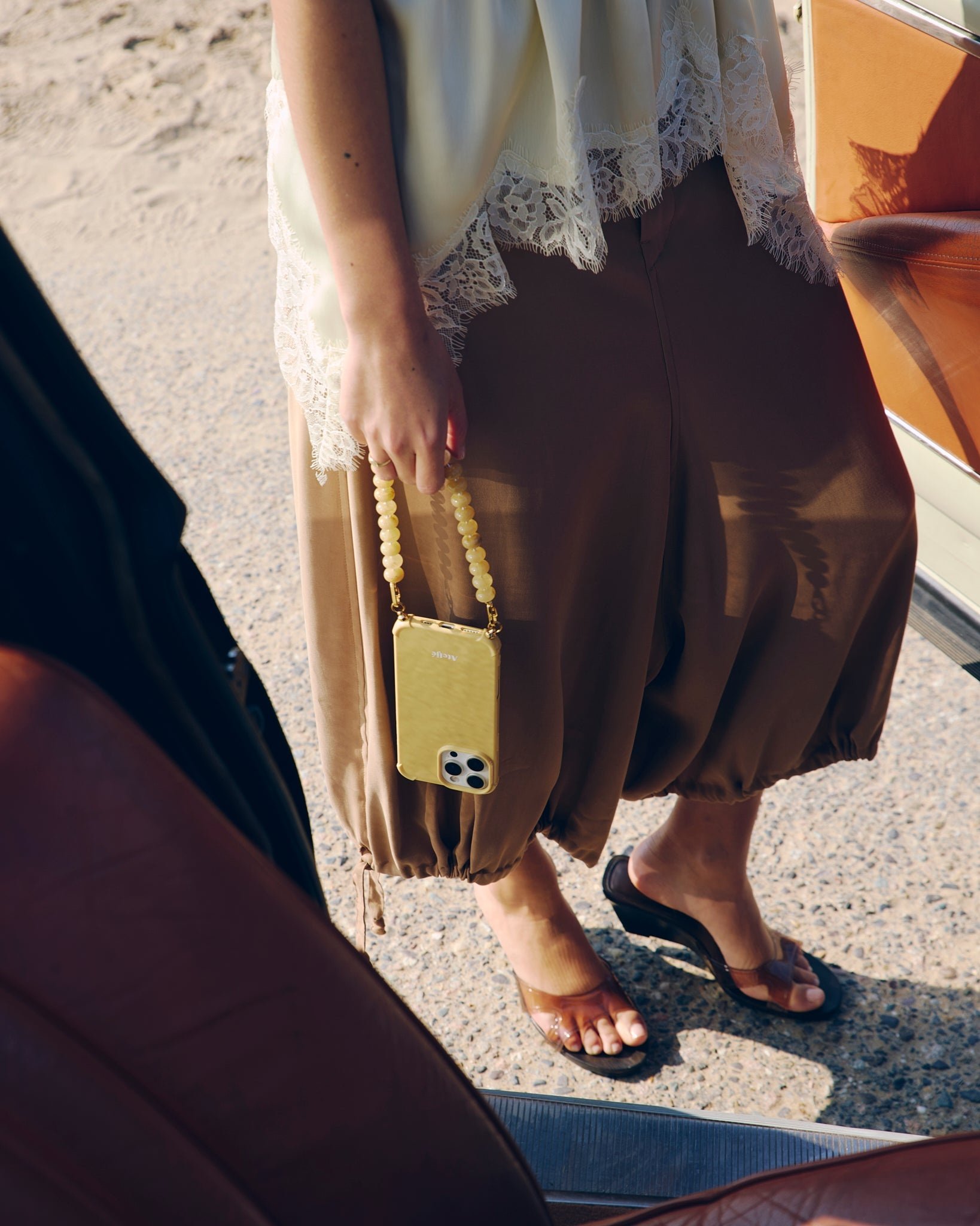 Bare heeft oversized beige kralen die een subtiele uitstraling geven en je telefoon precies op zijn plek houden. Neutraal, sculpturaal en verrassend veelzijdig. Het bewijs dat minimalistisch niet onopvallend hoeft te zijn.