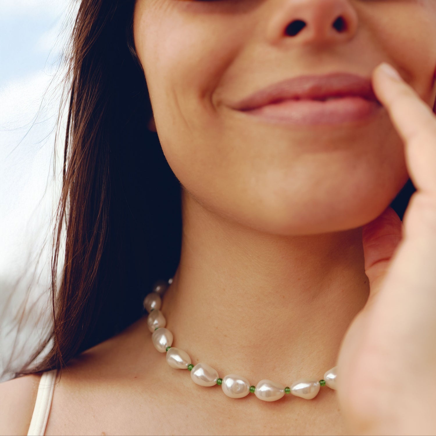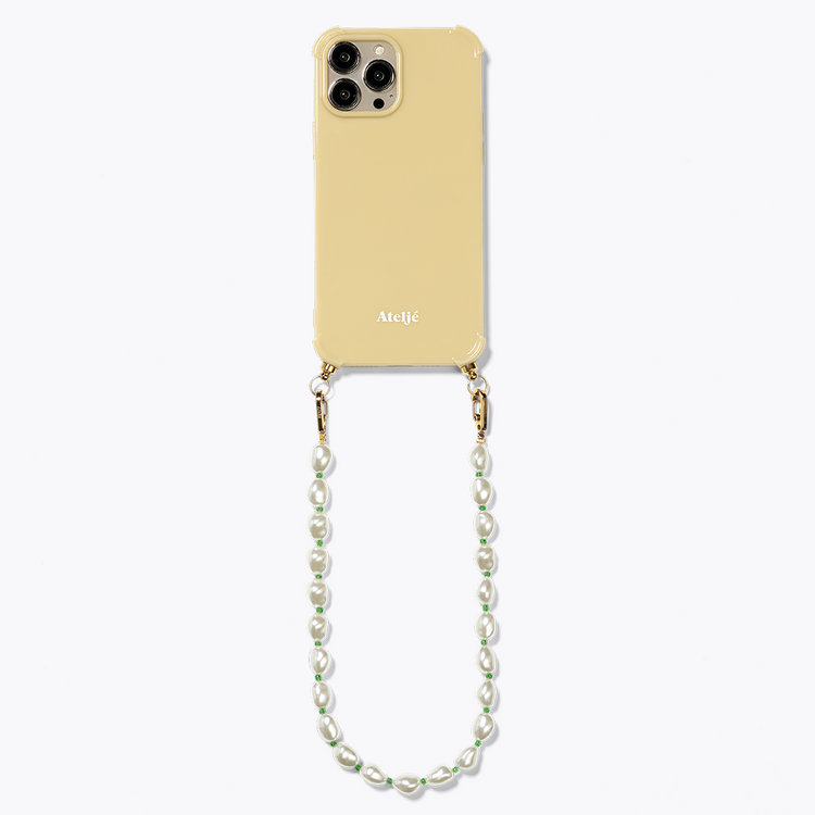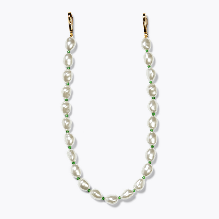 - Het snoer is gemaakt van 100% gerecycled plastic (ABS) gebroken witte parels met kleine groene kraaltjes