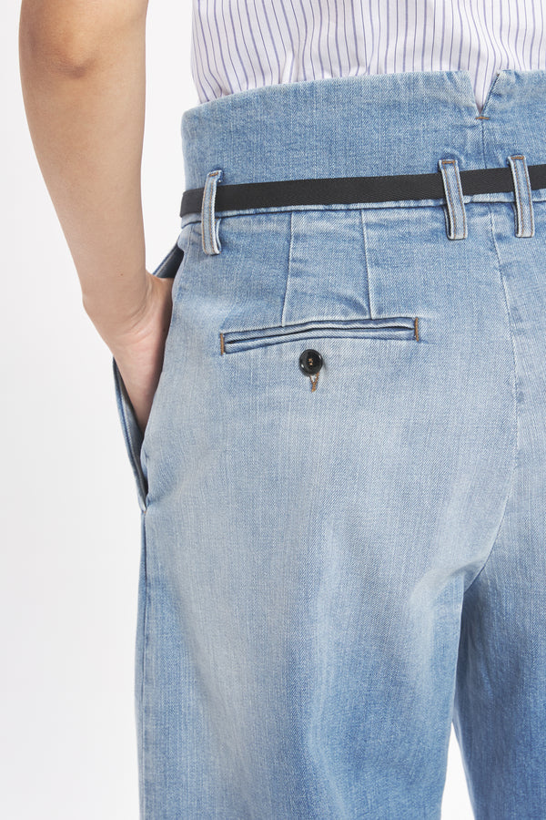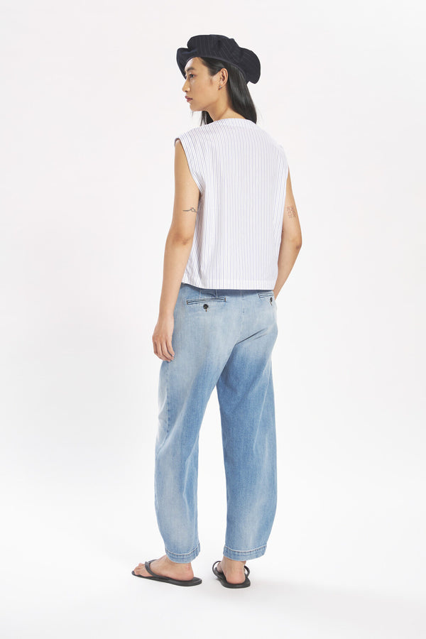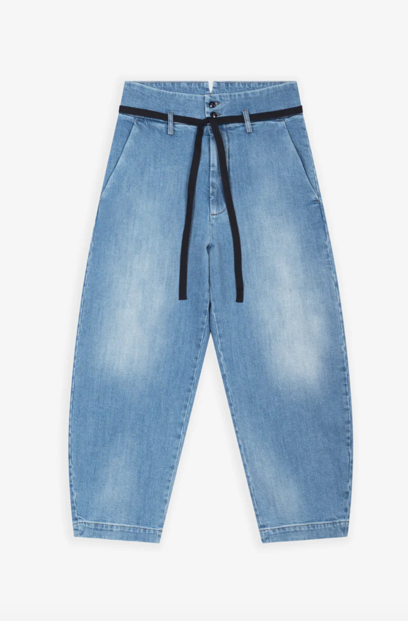 Deze broek met hoge taille en gebogen pijpen combineert comfort met functionaliteit. Gemaakt van gewassen katoenen denim, voelt hij duurzaam maar toch zacht aan, ideaal voor dagelijks gebruik.