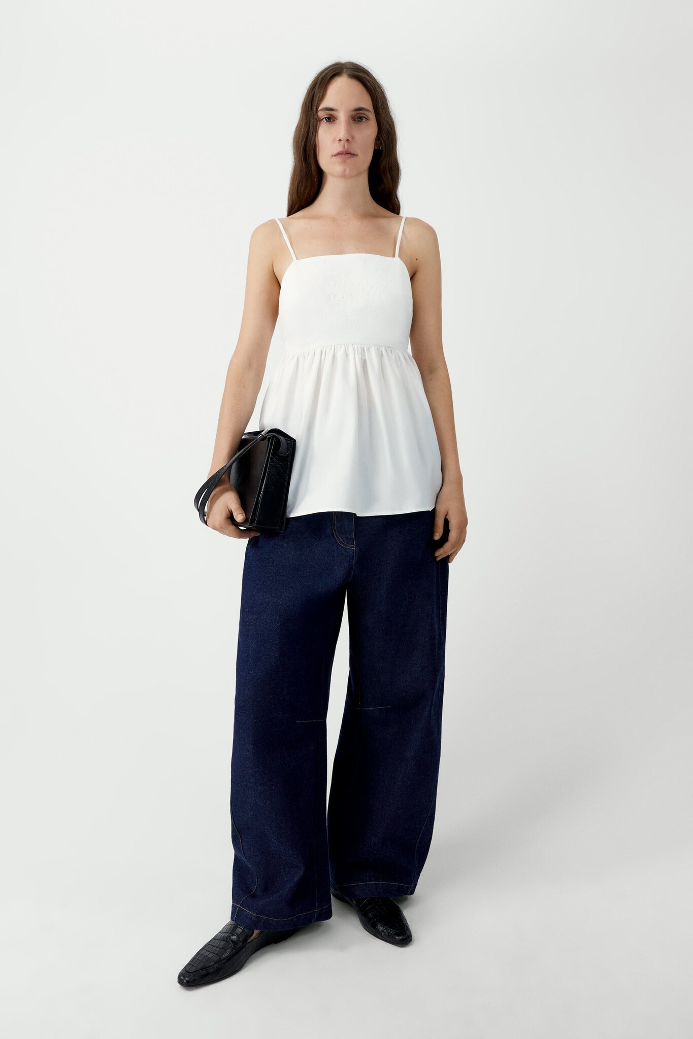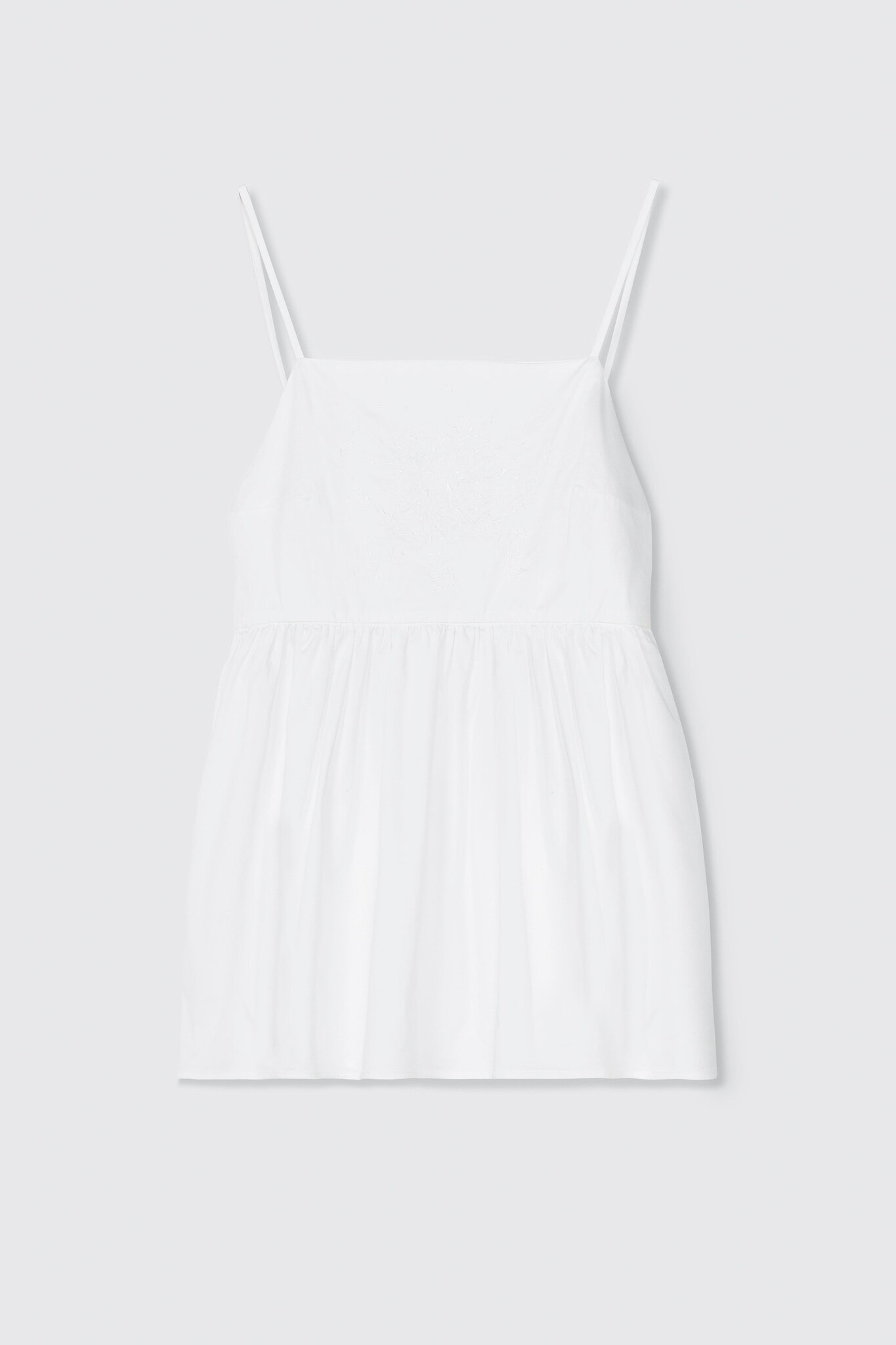 Zomertop met subtiele, ton-sur-ton bloemenborduursels op de borst. Het ontwerp met een lage rug en verstelbare plooien met trekkoord zorgt voor een perfecte pasvorm. De top is afgewerkt met delicate spaghettibandjes en een vierkante halslijn.