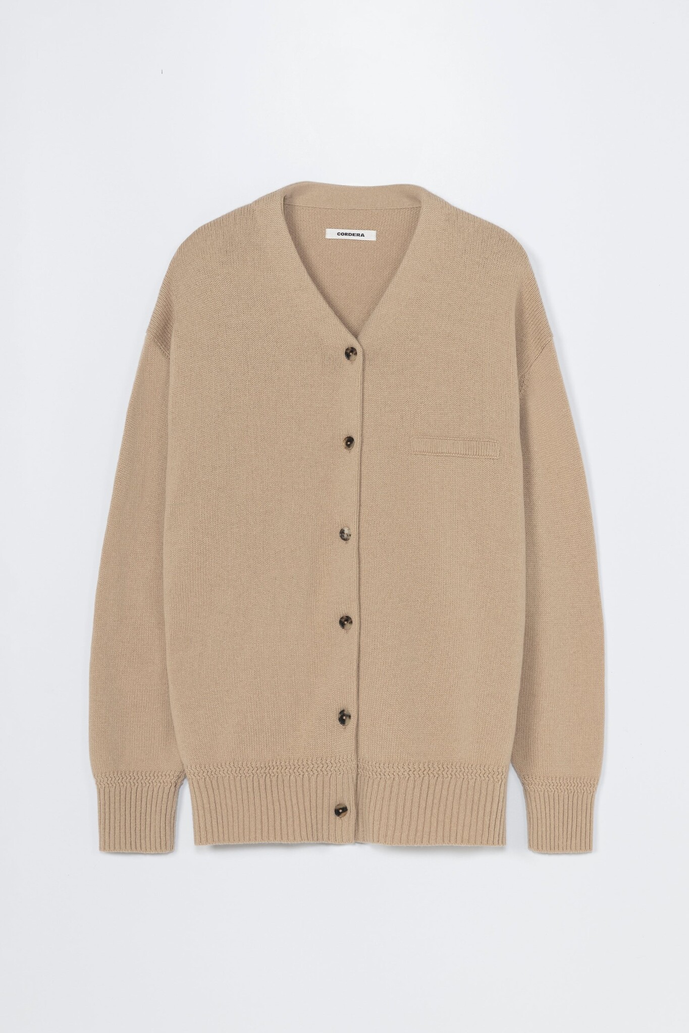 Middellange cardigan gemaakt van ultrafijne merinowol. Met zijsplitten en een flatterende V-hals met een doorlopende knoopsluiting. Licht oversized pasvorm met lange mouwen voor een ontspannen silhouet.