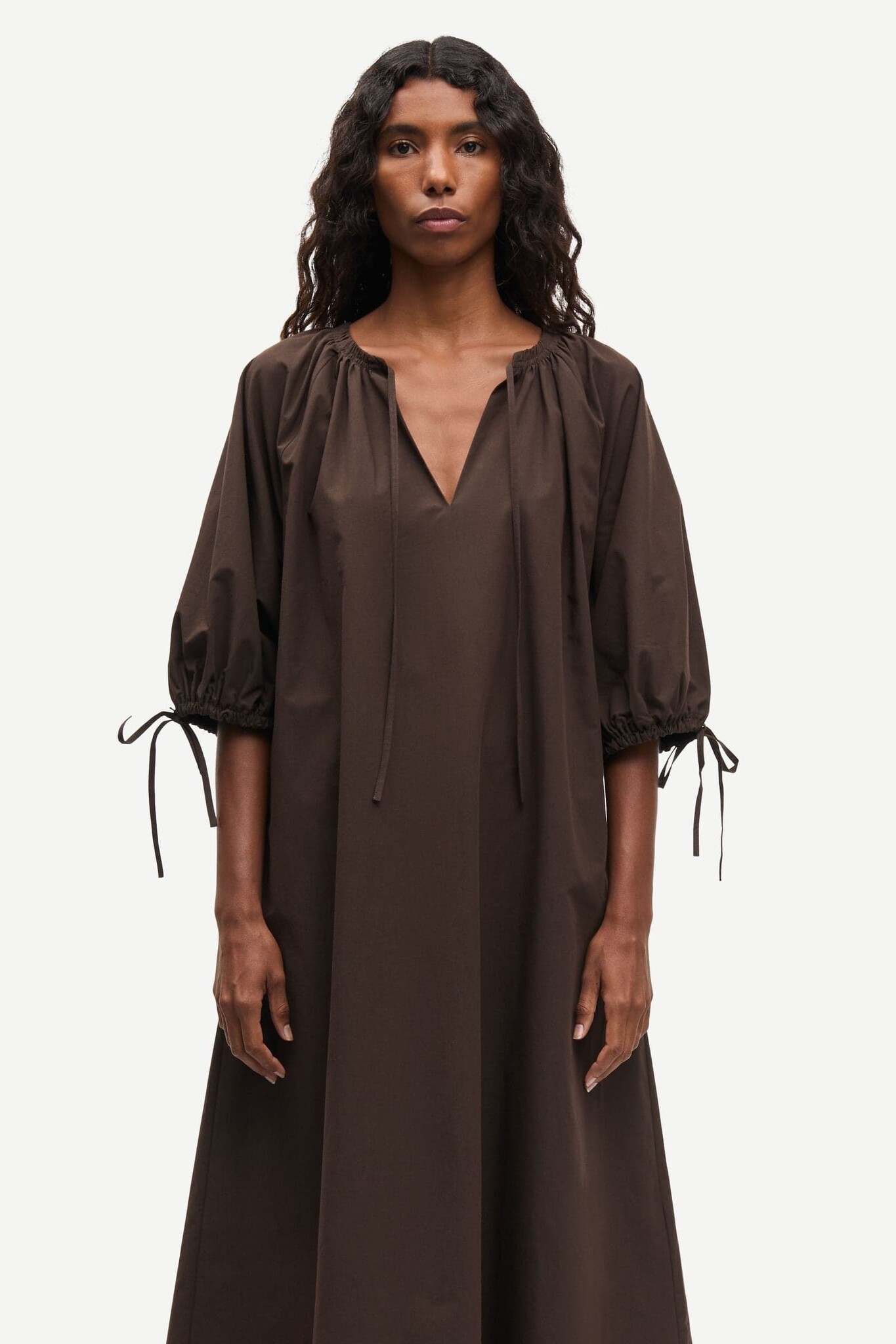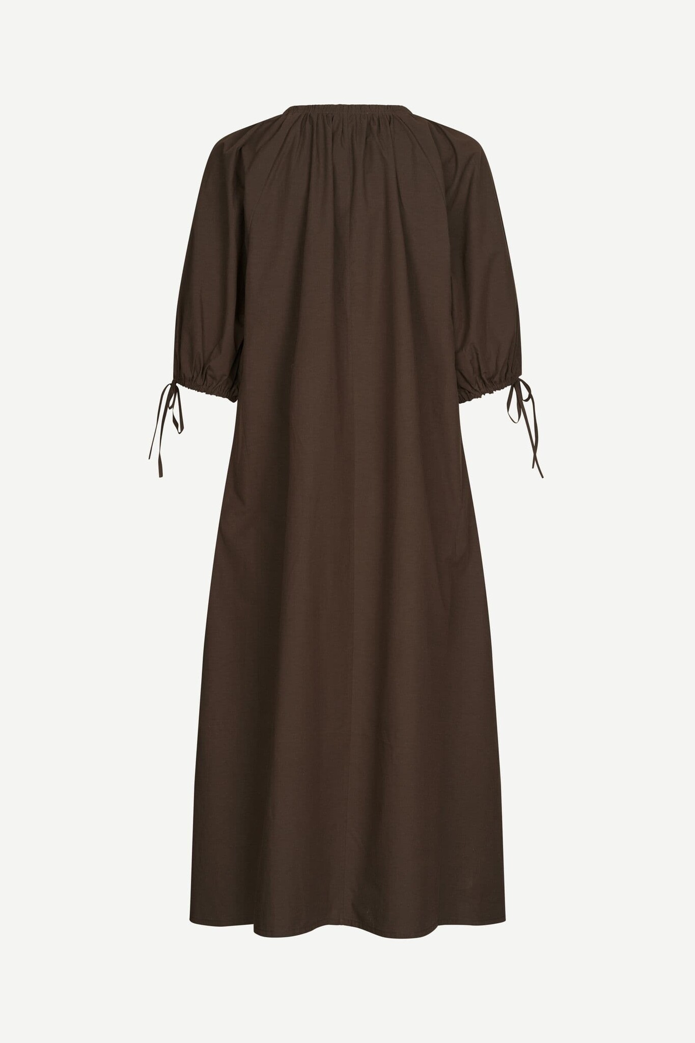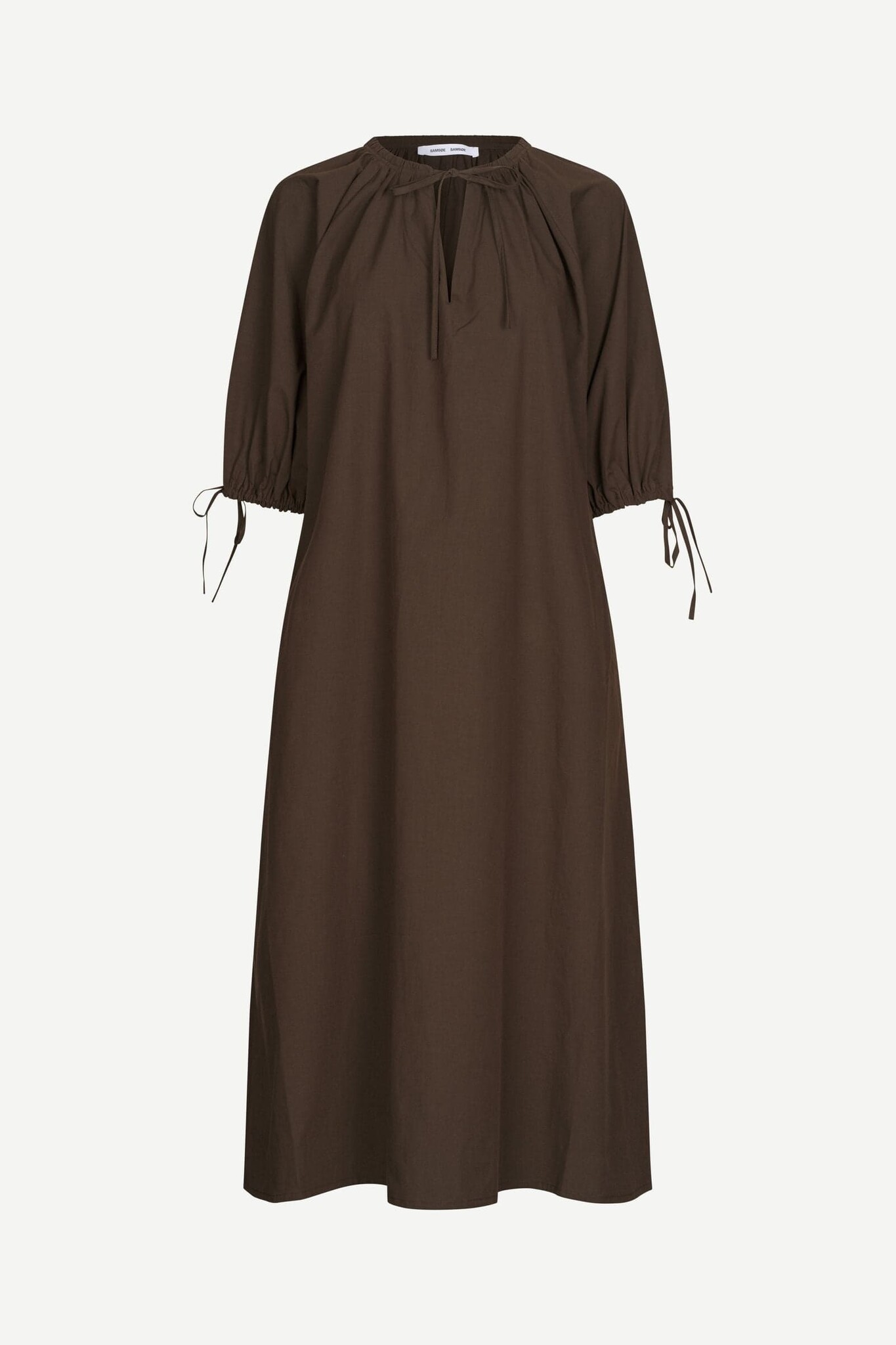 Midi-jurk met een losse pasvorm en een A-lijn rok. Striksluiting aan de voorkant. V-hals en hoge rug.