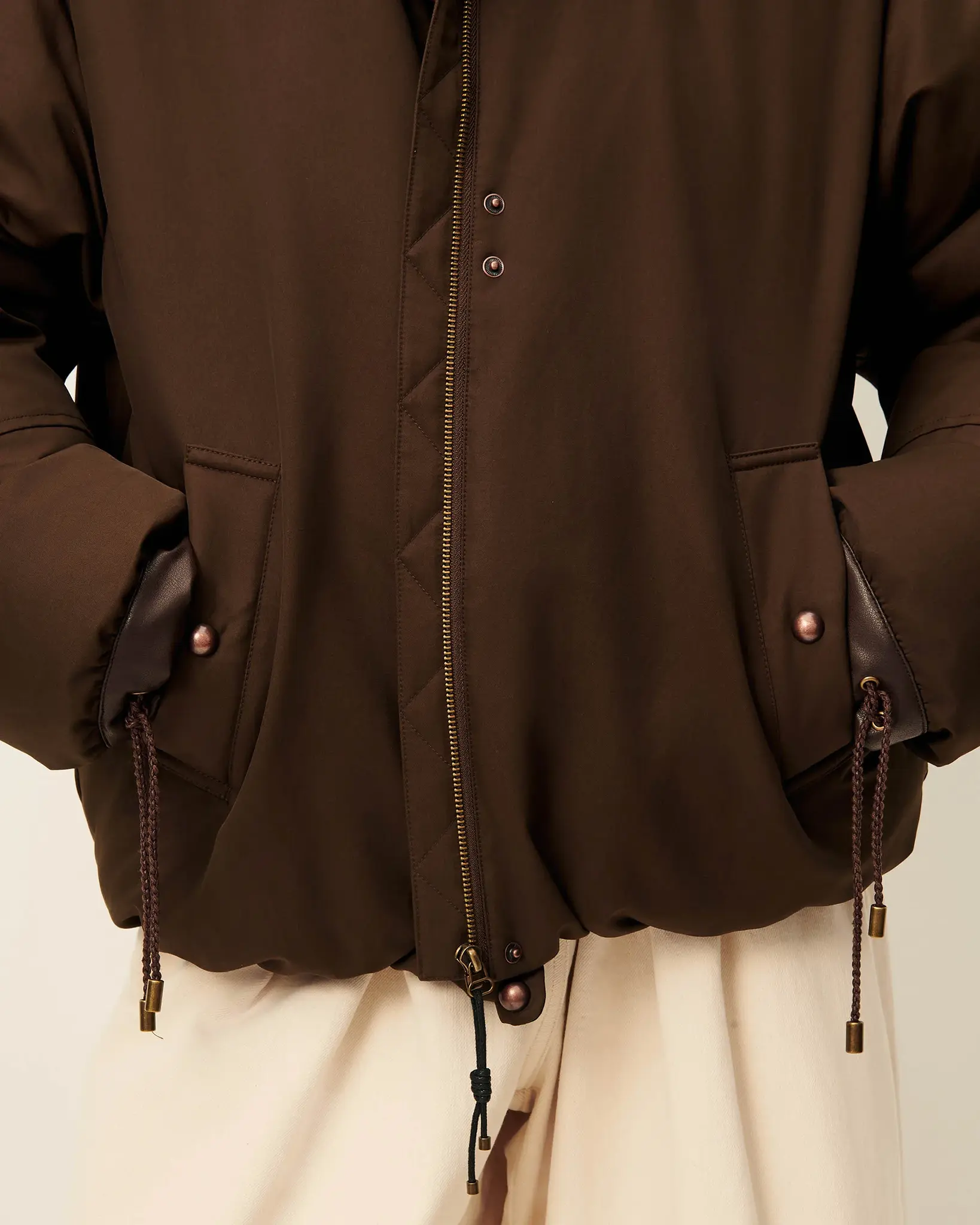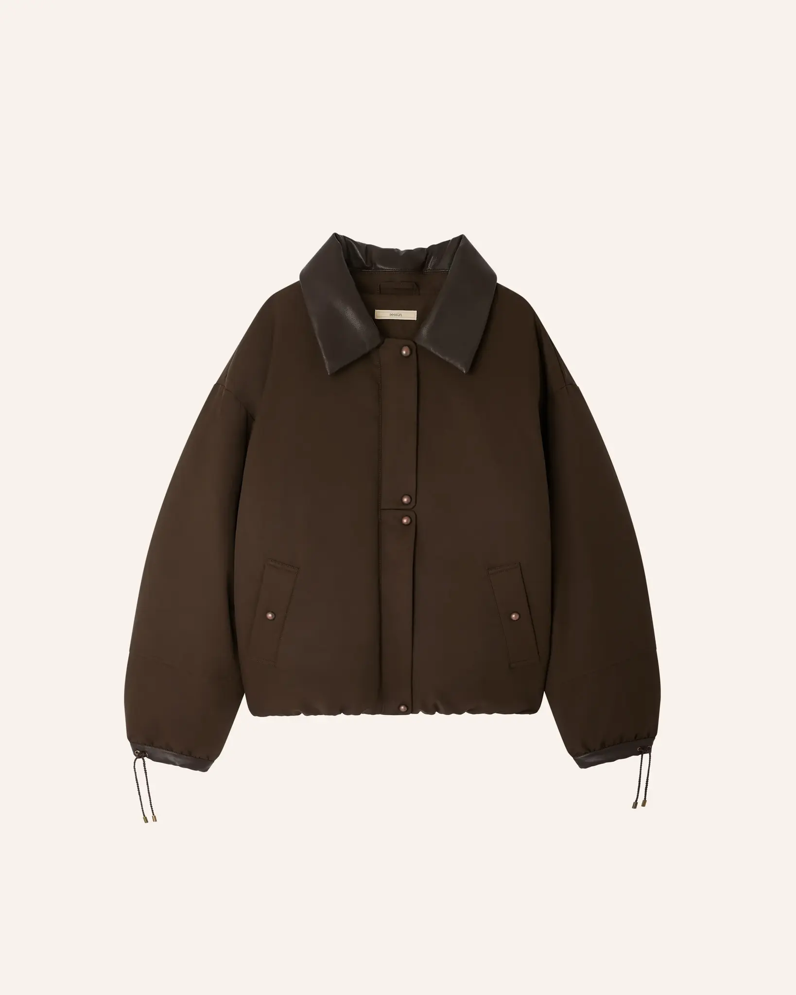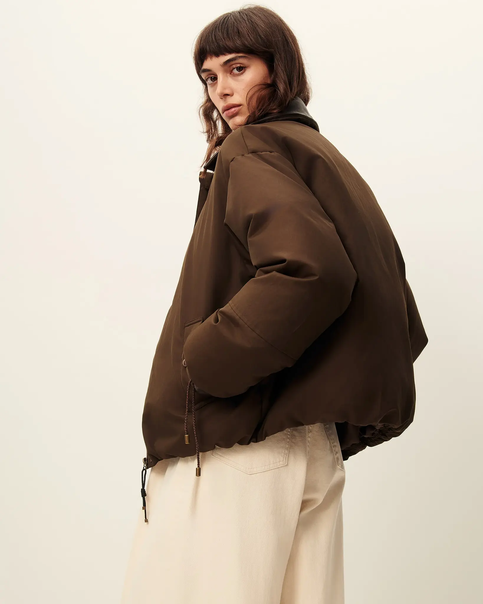 Pufferjack van compact, waterafstotend katoen en polyester canvas, gewatteerd met gecertificeerd natuurlijk dons en veren. Kraag en manchetten van imitatieleer.