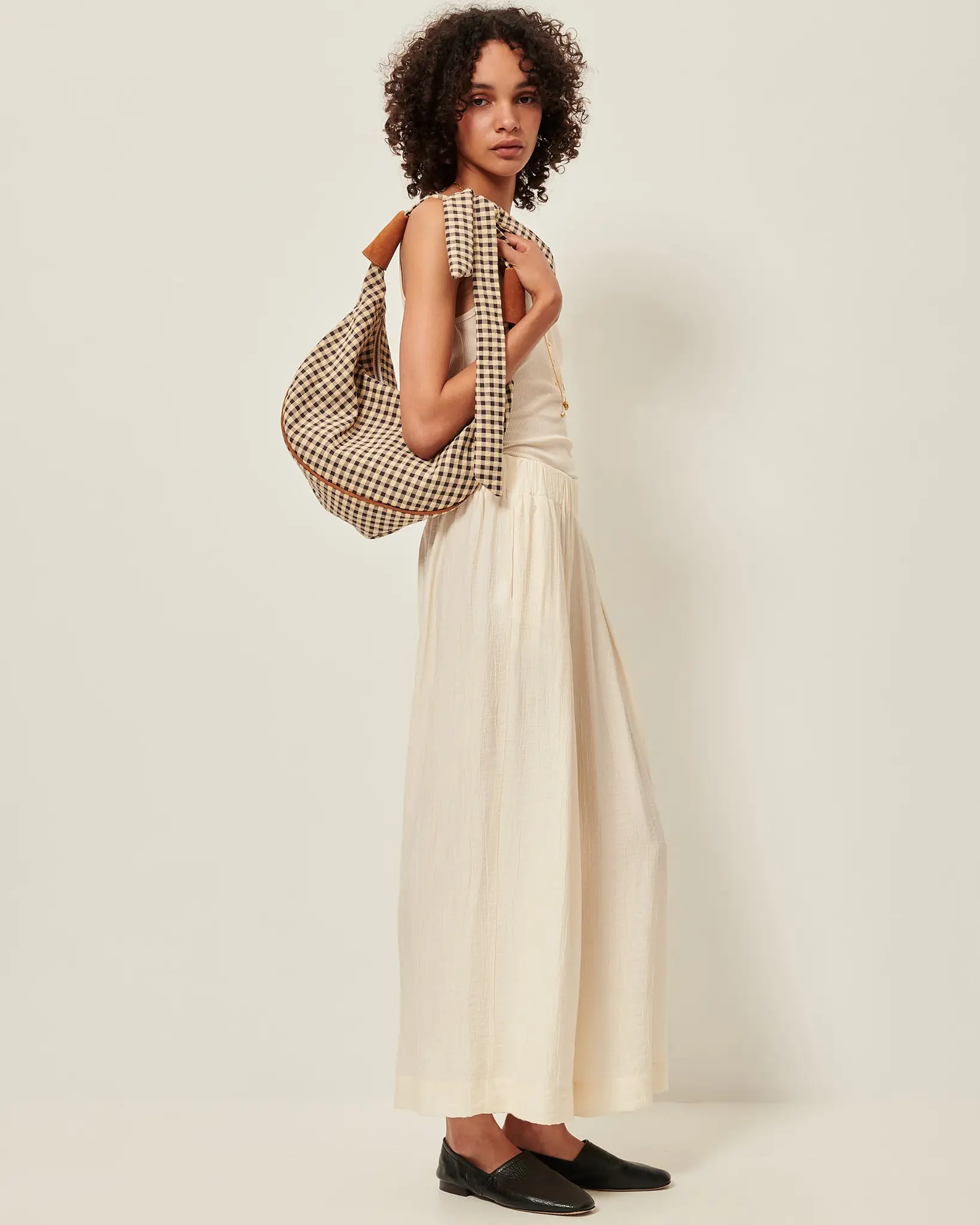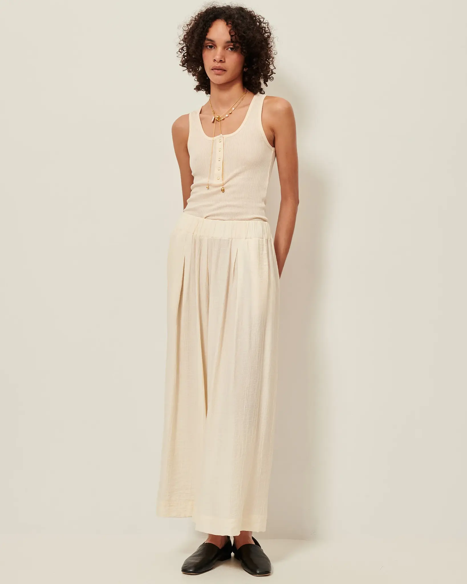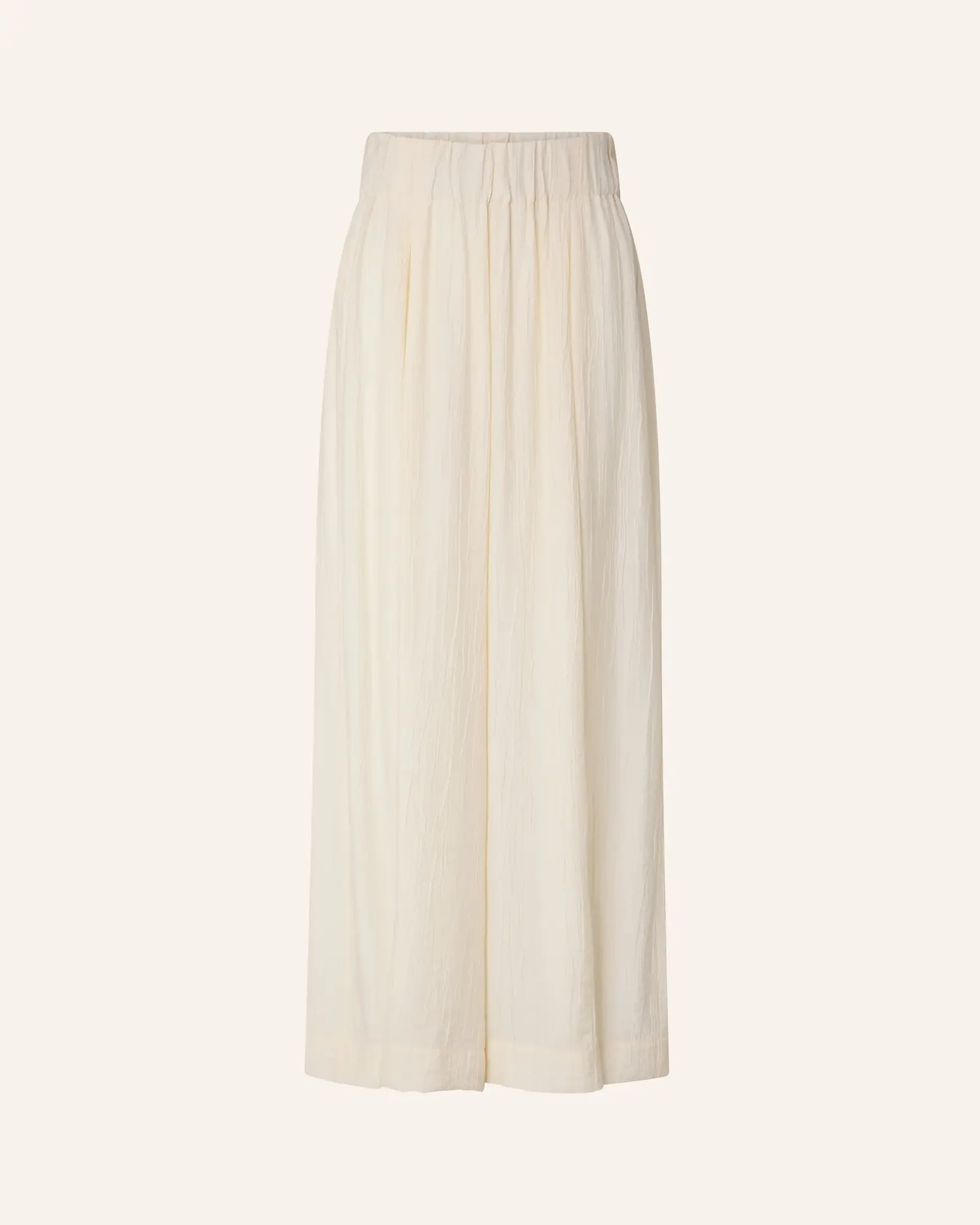 Loose-fitting 7/8-length trousers with elasticated waistband in soft viscose seersucker crepe.